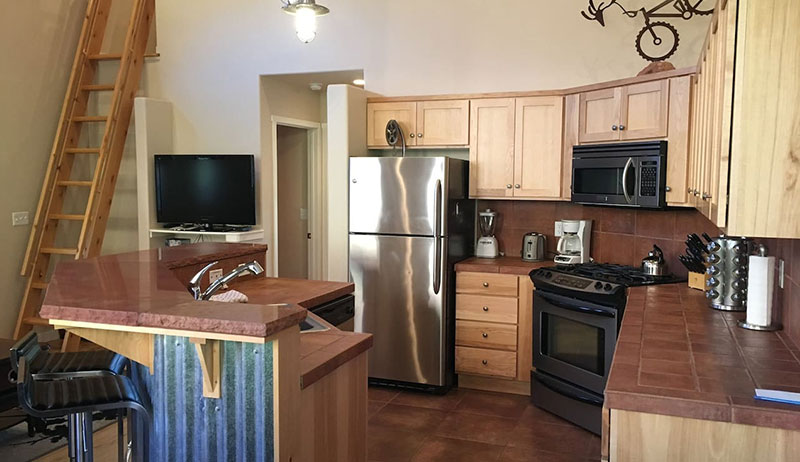 Unit 19 is our spacious and adventure-ready 1 bedroom townhouse with great views of the desert red rock in front and the green of our resort and The Portal in the back. Enjoy the fresh air and views in any of the three private outdoor lounge spaces. The main deck comes complete with an outdoor dining table, BBQ Grill and a fireplace to stay cozy and comfortable on cooler nights. Two parking spots in the carport will shade your vehicles from the sun and provides easy storage for your adventure toys. The master bedroom has a king-sized bed, flat screen TV, and a Juliet balcony to observe your surroundings. Just off of the living room is access to the loft space which includes 2 twin beds, perfect for kids and young adults. If you enjoy cooking on your vacation, the kitchen is fully stocked with cooking accessories or just take a walk down the road to Atomic Grill. The main floor has a half bath, a washer and dryer, and a small room perfect to house and sort your gear.